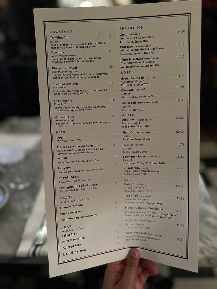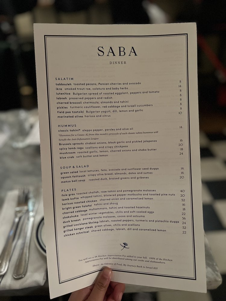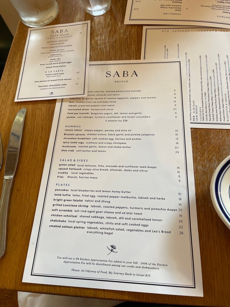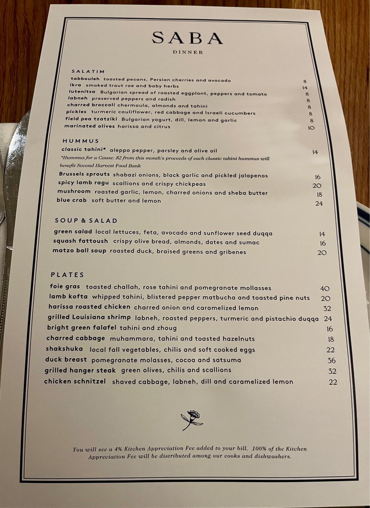 Introducing the menu at Saba, a Middle Eastern-Mediterranean gem in New Orleans that offers a trendy, intimate, and upscale dining experience. Saba boasts a diverse menu with vegan and vegetarian options, including mouth-watering lamb kofta and bright green falafel that customers rave about. The fresh pita baked in a coal-fired oven and flavorful hummus are not to be missed. Customers also praise the blue crab hummus, labneh, and harissa chicken. The relaxed yet classy ambiance, efficient service, and delicious desserts make Saba a must-visit. With options for brunch, lunch, dinner, and dessert, Saba provides a satisfying dining experience for all. So, if you're looking to indulge in fresh, healthy, and flavorful Middle Eastern cuisine in a chic setting, Saba is the perfect choice.